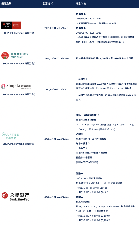 且各銀行、支付廠商及 SHOPLINE 保留隨時修改、變更、暫停或終止本活動內容之權利。